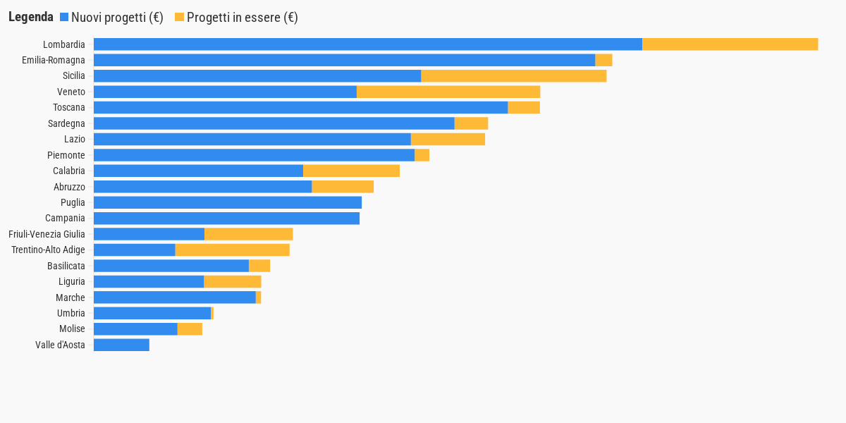 Complessivamente i progetti finanziati per la riduzione del rischio di alluvione e idrogeologico sono 1.725 per un ammontare complessivo di circa 1,15 miliardi di euro assegnati (sostanzialmente tutte le risorse disponibili). A livello complessivo a ricevere più risorse è la Lombardia (136,9 milioni per 320 progetti). Al secondo posto per quota di risorse totali assegnate troviamo proprio l’Emilia Romagna (circa 98 milioni di euro per 222 progetti). Tra le aree del paese che ricevono i finanziamenti maggiori troviamo infine anche Sicilia (circa 97 milioni per 48 progetti), Veneto (84,4 milioni per 26 progetti) e Toscana (84,3 milioni per 37 progetti).
