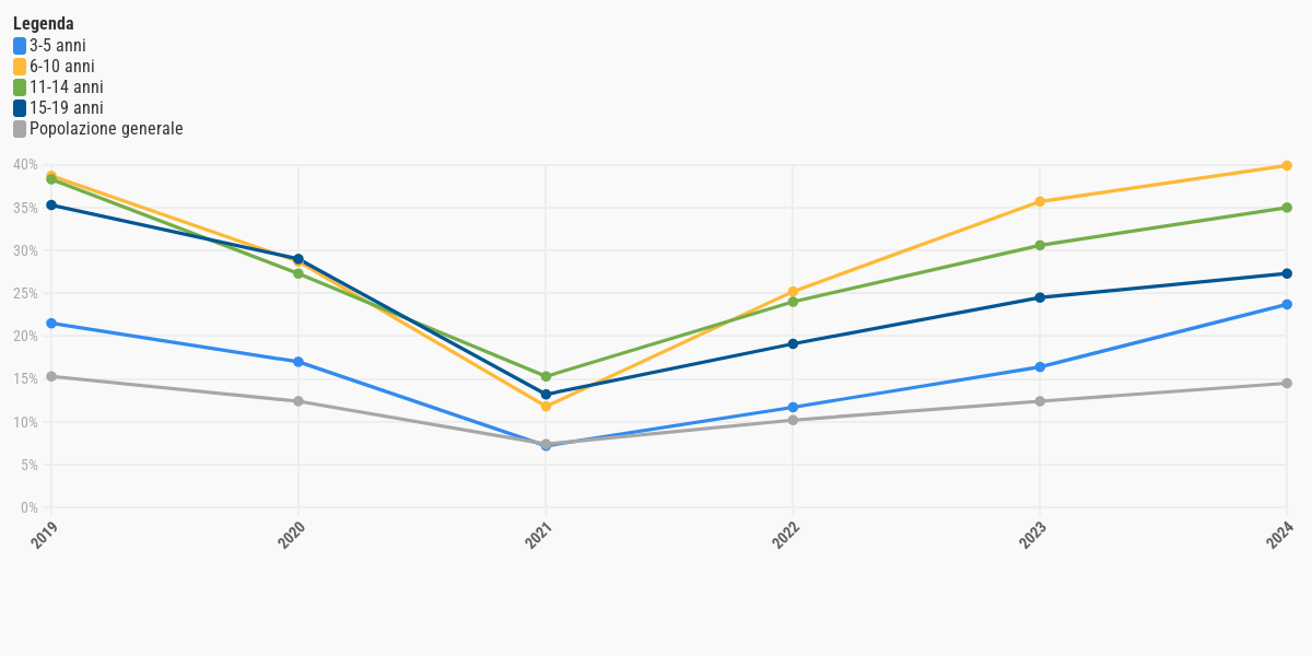 Non tutte queste fasce riportano dei risultati in linea o maggiori rispetto al periodo pre-pandemico. Sono infatti aumentate quella tra 3 e 5 anni (+2,2 punti percentuali) e tra 6 e 10 (+1,2) mentre calano quella tra 11 e 14 (-3,3) e quella tra 15 e 19 (-8). Sono quindi più basse le percentuali dei ragazzi pre-adolescenti e adolescenti rispetto a quelle dei bambini.