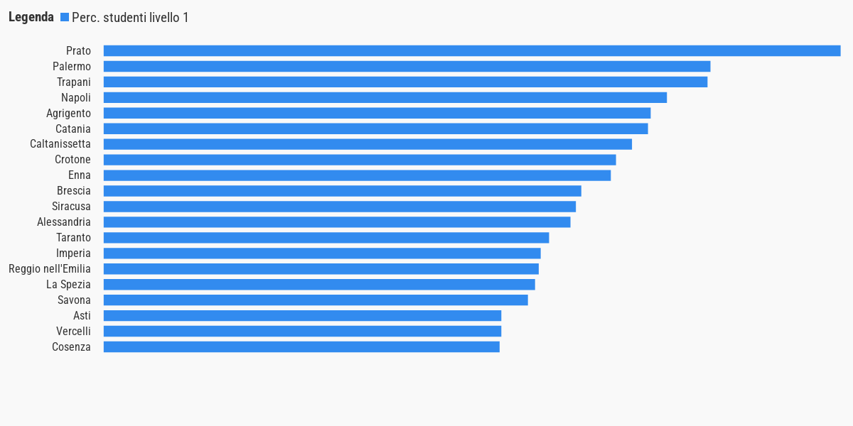 I dati presentati per ciascun comune corrispondono alla percentuale di studenti in ciascun livello di apprendimento (da 1 a 5, metodologia qui). La classifica qui presentata è stata elaborata per le sole città capoluogo di provincia e di città metropolitana.