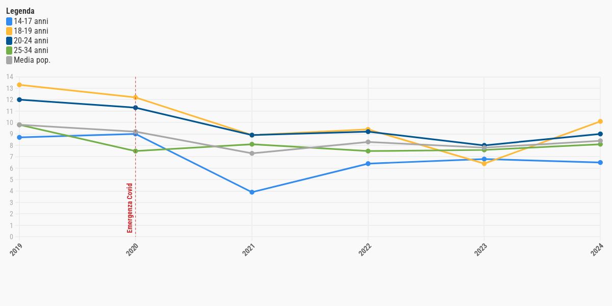 Rispetto all’ultimo anno prima del Covid, il contributo della popolazione in associazioni di volontariato è diminuito in modo diffuso. Nel 2024 si registrano segnali importanti nella popolazione giovanile, con il ritorno sopra il 10% di queste attività tra 18 e 19 anni.